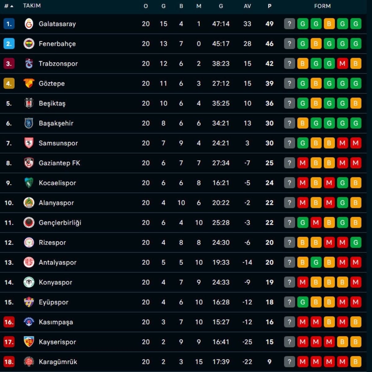 Süper Lig’de 20. hafta maçları tamamlanırken haftayı 3 puanla kapatan Galatasaray liderliğini sürdürdü.