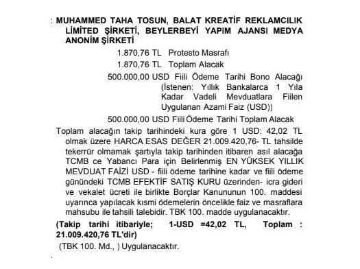 MedyaRadar’da yer alan habere göre bunun üzerine yatırımcı, Muhammed Taha Tosun tarafından imzalanan 500 bin dolarlık (22 milyon 42 bin lira) senedi işleme koydu. Muhammed Taha Tosun’un yatırımcıya “zarar ettim” diyerek parayı daha sonra ödeyeceğini söylediği ancak ödeme yapmadığı öne sürüldü.