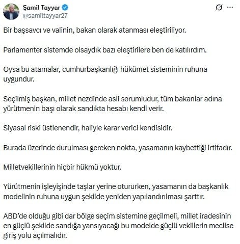 Akın Gürlek’in Adalet Bakanlığı’na, Mustafa Çiftçi’nin ise İçişleri Bakanlığı’na getirilmesini “yürütmenin taşlarının yerine oturması” olarak nitelendiren Tayyar, asıl sorunun Meclis’in işlevsizleşmesi olduğunu savundu.