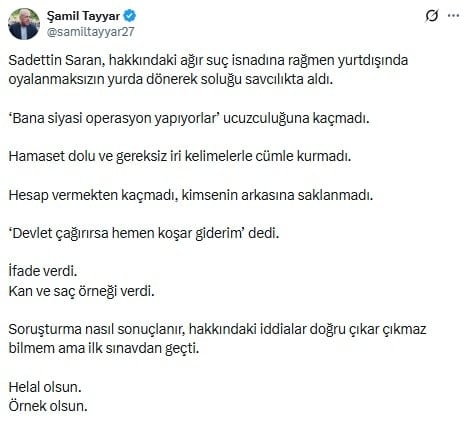 Saran’ın yaşadığı süreçle ilgili AKP cephesinden ilk açıklama eski milletvekili Şamil Tayyar’dan geldi.