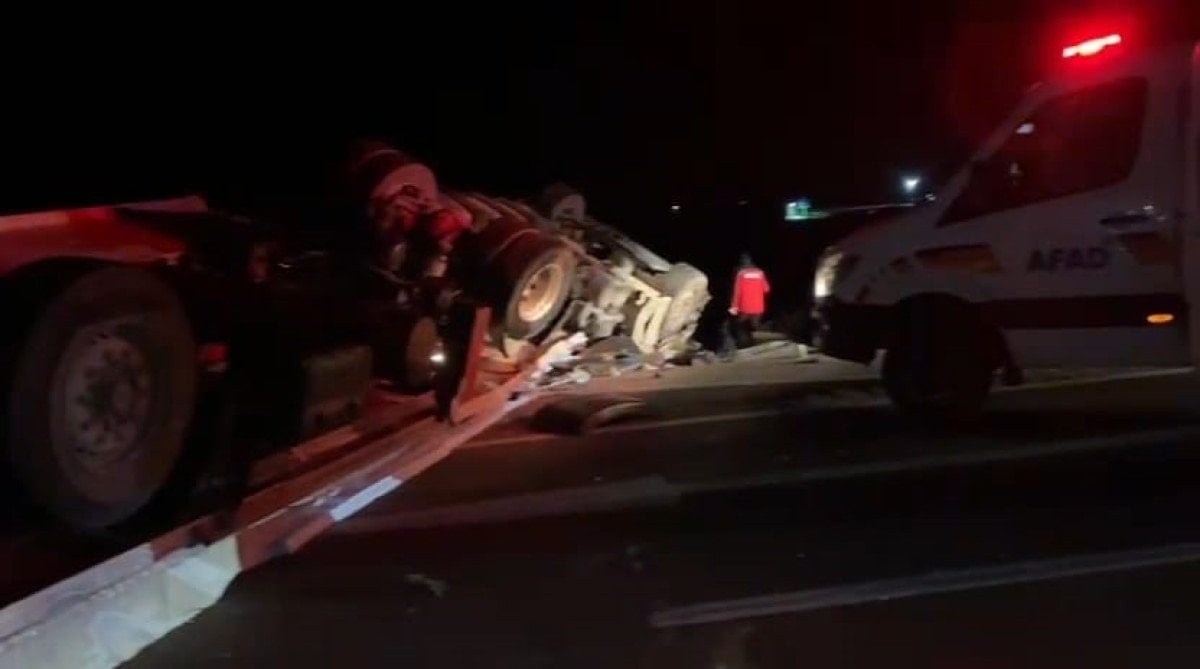 Kontrolden çıkan tır önce bariyerlere çarptı sonra yola devrildi.
