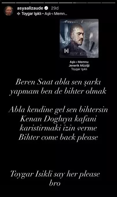 “Beren Saat abla, şarkı yapma, ben de Bihter olmak istiyorum. Abla, kendine gel, sen Bihter’sin. Kenan Doğulu’ya kafanı karıştırmasına izin verme.”