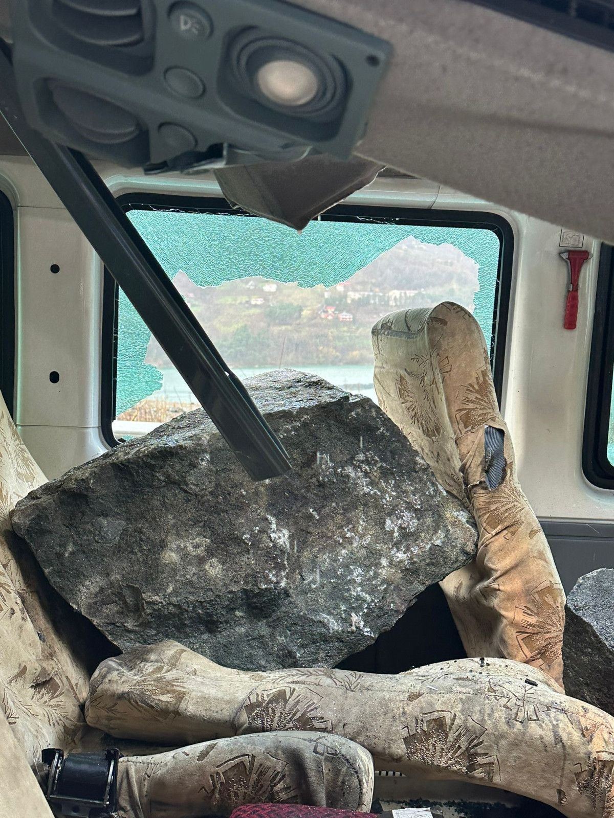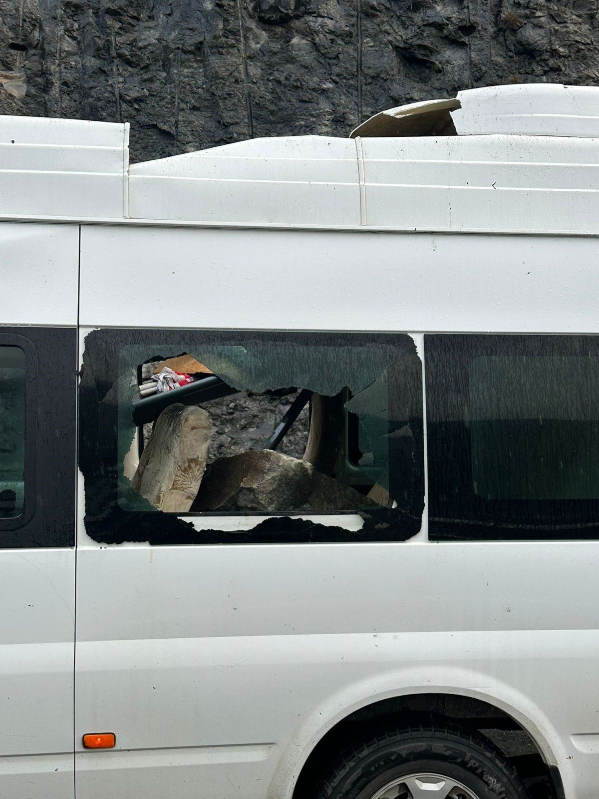 Kaya, minibüsün tavanını parçalayarak araç içerisine girerken, koltuğun üzerine düştü.