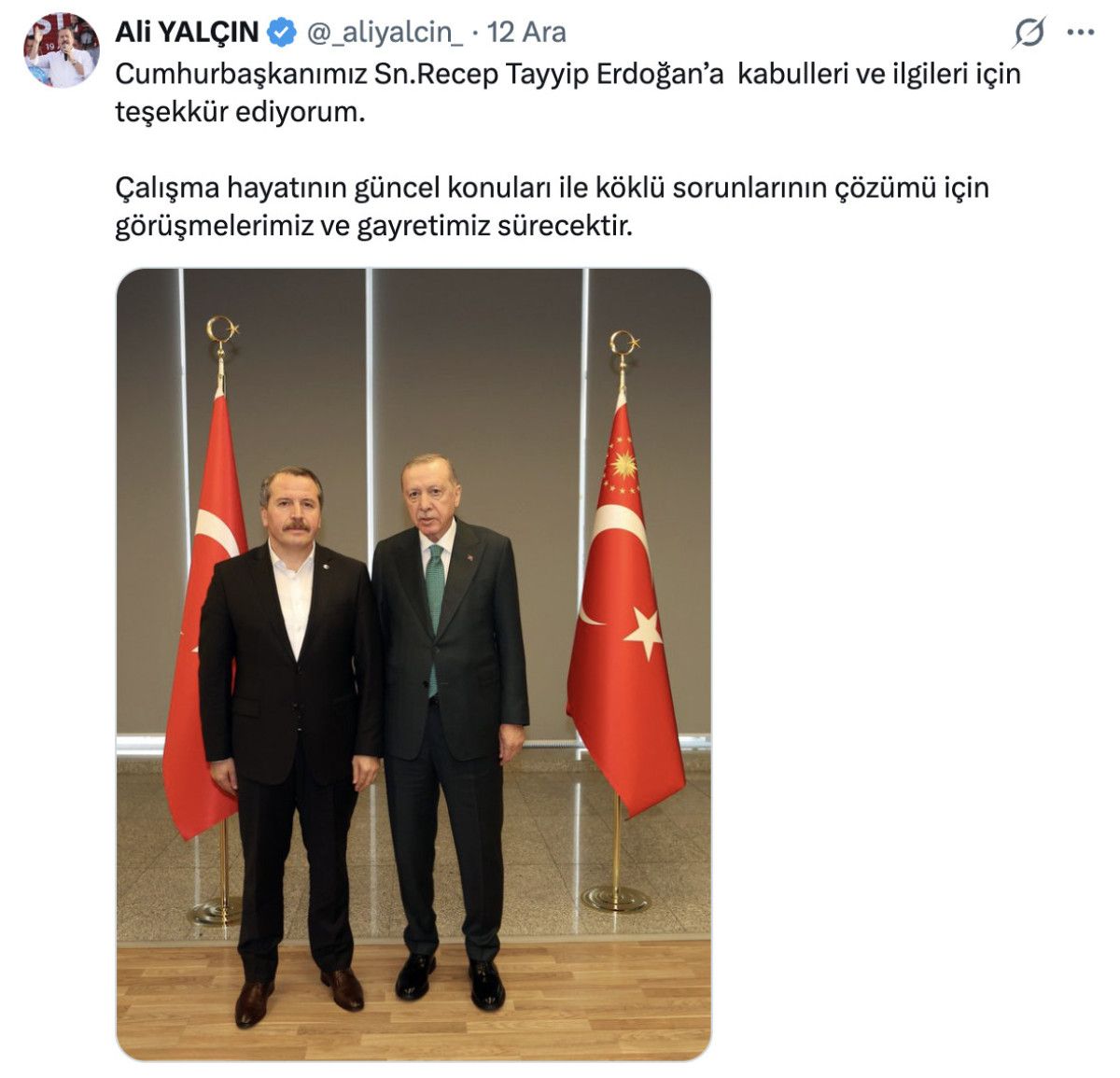 Görüşmenin ardından Yalçın, çalışma hayatına ilişkin temasların süreceğini belirterek, “Cumhurbaşkanımız Sn. Recep Tayyip Erdoğan’a kabulleri ve ilgileri için teşekkür ediyorum. Çalışma hayatının güncel konuları ile köklü sorunlarının çözümü için görüşmelerimiz ve gayretimiz sürecektir.” ifadelerini kullandı.