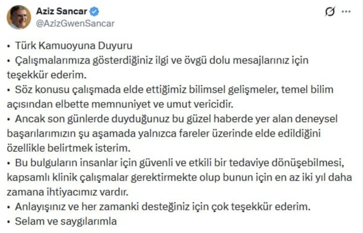 Türk bilim insanı Prof. Dr. Sancar ise klinik deneyler için süre vererek şu açıklamayı yaptı: