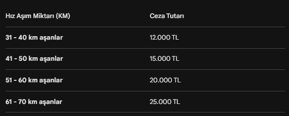 2026 YENİ KADEMELİ HIZ CEZALARI LİSTEDİ