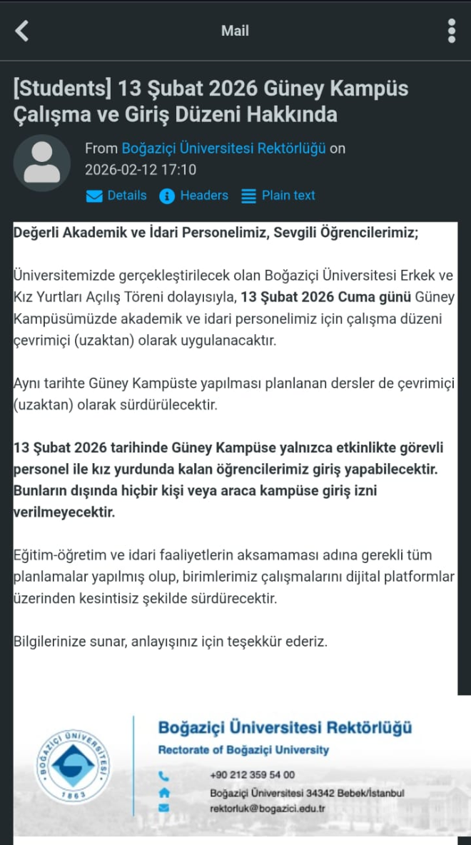 Boğaziçi Üniversitesi yönetimi tarafından akademik ve idari personel ile öğrencilere gönderilen resmi duyuru, kampüste “kırmızı alarm” verildiğini ortaya koydu. 13 Şubat 2026 Cuma günü düzenlenecek açılış törenleri nedeniyle Güney Kampüs’te fiziksel eğitime ara verildi.