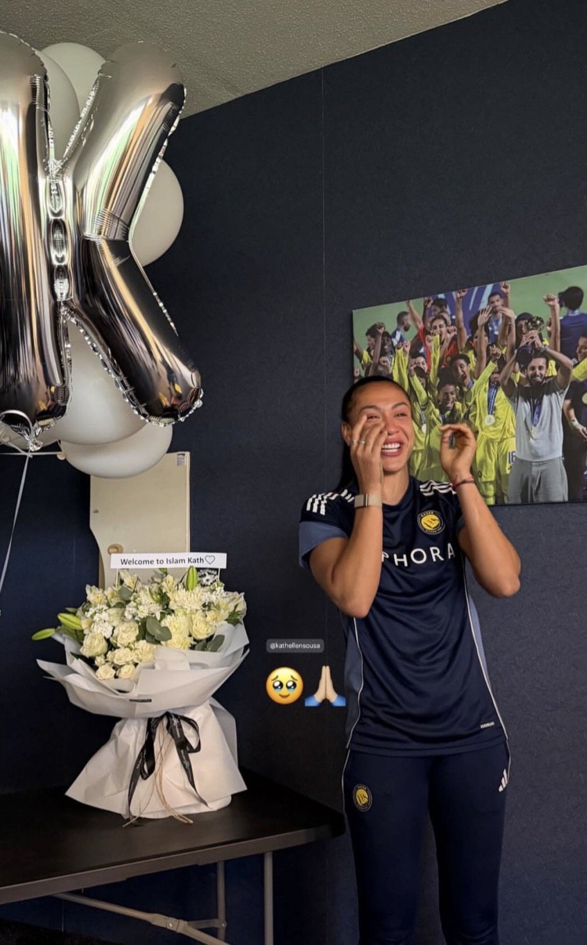 Al Nassr Kadın Futbol Takımı yaptığı sosyal medya paylaşımında, “Kathellen Sousa’nın İslam’ı kucakladığı bu özel anı paylaşıyor ve kalbinin huzur ve dinginlikle dolu olmasını diliyoruz.” ifadelerini kullandı.