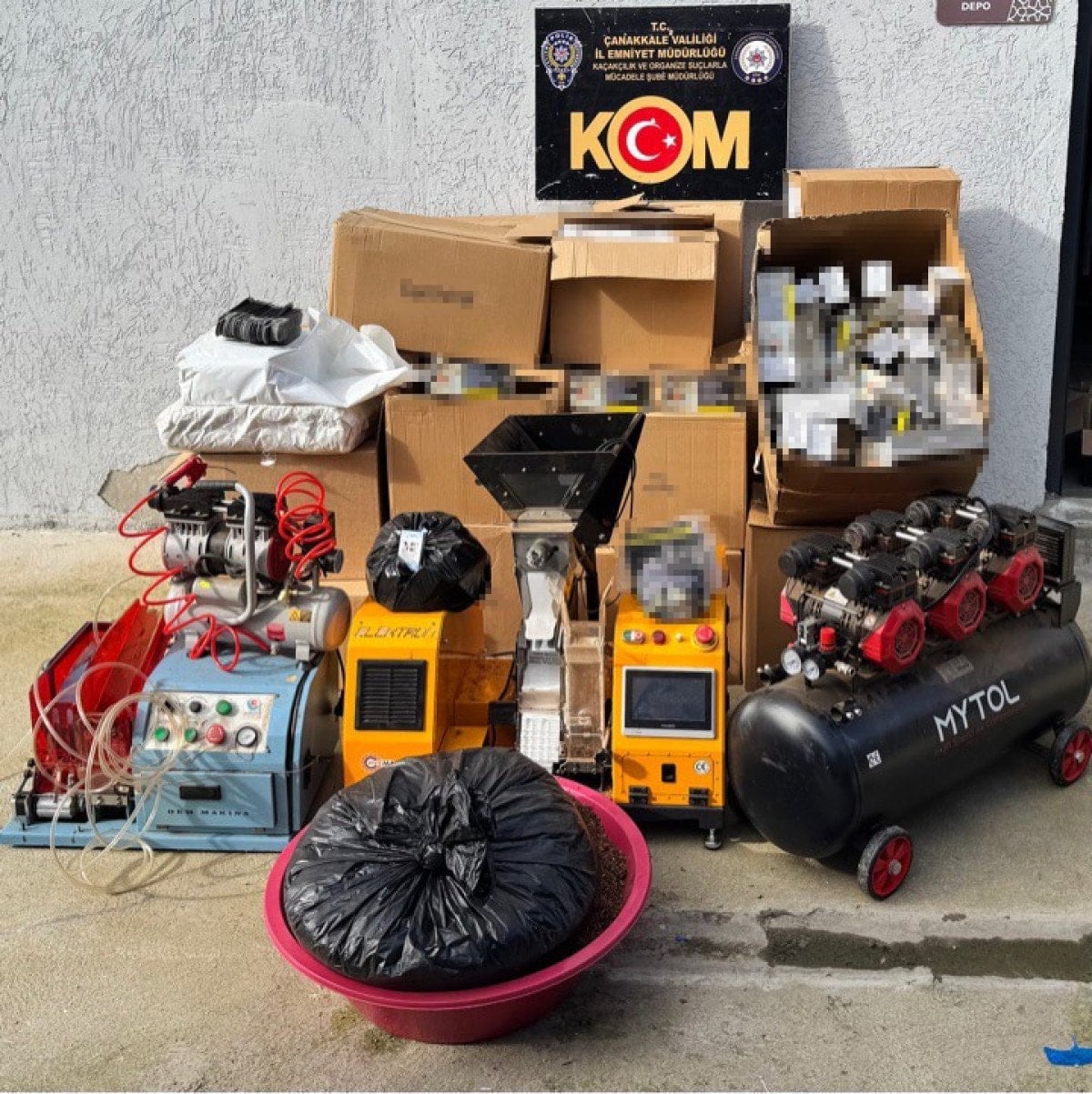 Şüphelilerin ikamet ve araç aramalarında yapılan aramalarda; çelik jop, para alışverişlerine ilişkin notların yazıldığı 2 ajanda 251 bin 400 TL, 100 euro, 50 dolar para, 2 sigara sarma makinesi, 2 hava kompresörü, 99 bin 400 boş makaron, 31 bin 940 dolu makaron, 635 paket 100’er gramlık bandrollü tütün, 3 bin boş sigara kutusu, 20 kilogram kıyılmış tütün ele geçirildi.