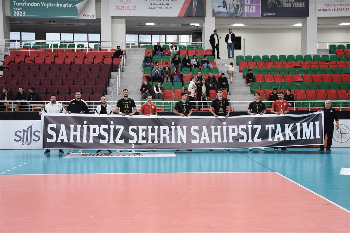 Daha sonra salonda Cizre Belediyespor Başantrenörü Burak Köse, antrenör Behmen Cıvıldak, takım kaptanı İbrahim Emet ve altyapı sporcuları “Sahipsiz şehrin sahipsiz takımı” yazılı pankart açtı.