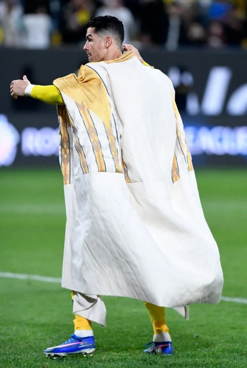 Portekizli yıldız, 22 Şubat Suudi Arabistan’ın kuruluş günü dolayısıyla maç sonunda ülkenin geleneksel kıyafeti olan “bisht”i giyerek taraftarları selamladı.
