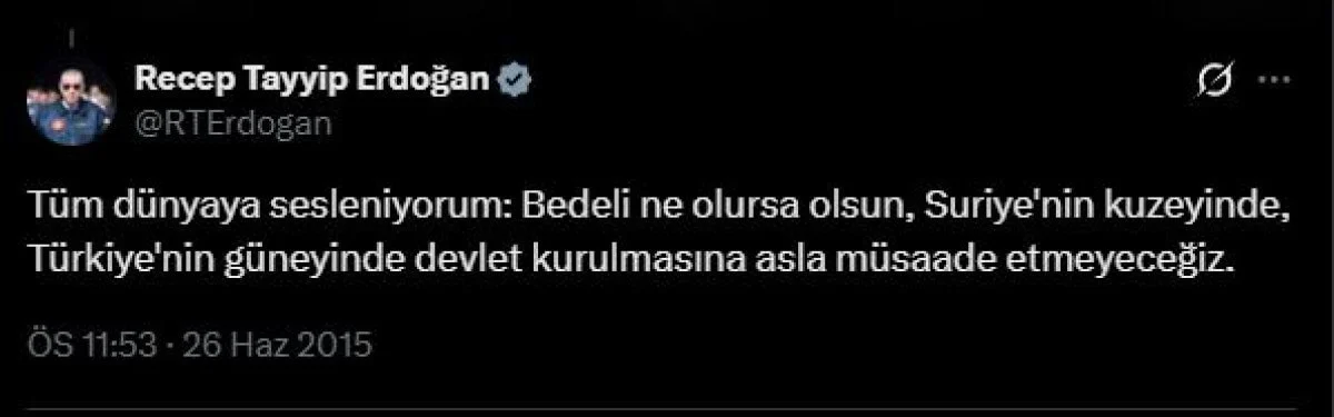 Buradan tüm dünyaya sesleniyorum, Suriye’nin kuzeyinde, güneyimizde bir devlet kurulmasına asla müsaade etmeyeceğiz. Bunun bilinmesini istiyorum. Bedeli ne olursa olsun bu konudaki mücadelemizi sürdüreceğiz.