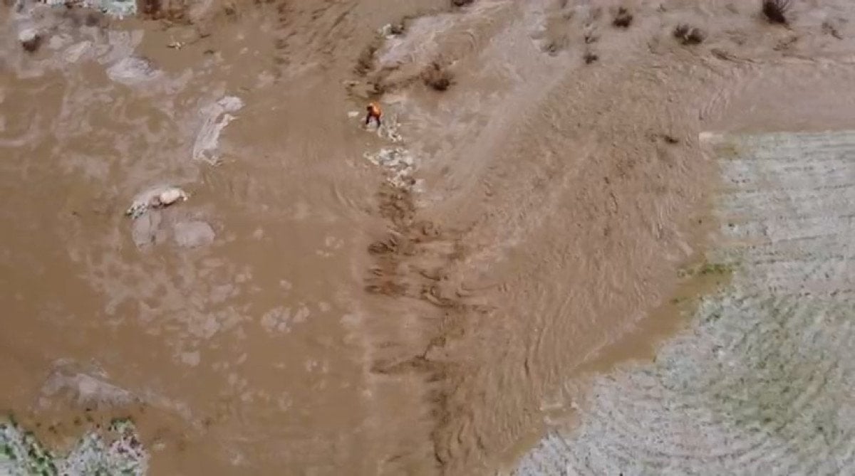 Selde mahsur kalan 1 kişi de traktörle kurtarıldı. Selin etkisi ve kurtarma anları, dronla görüntülendi.