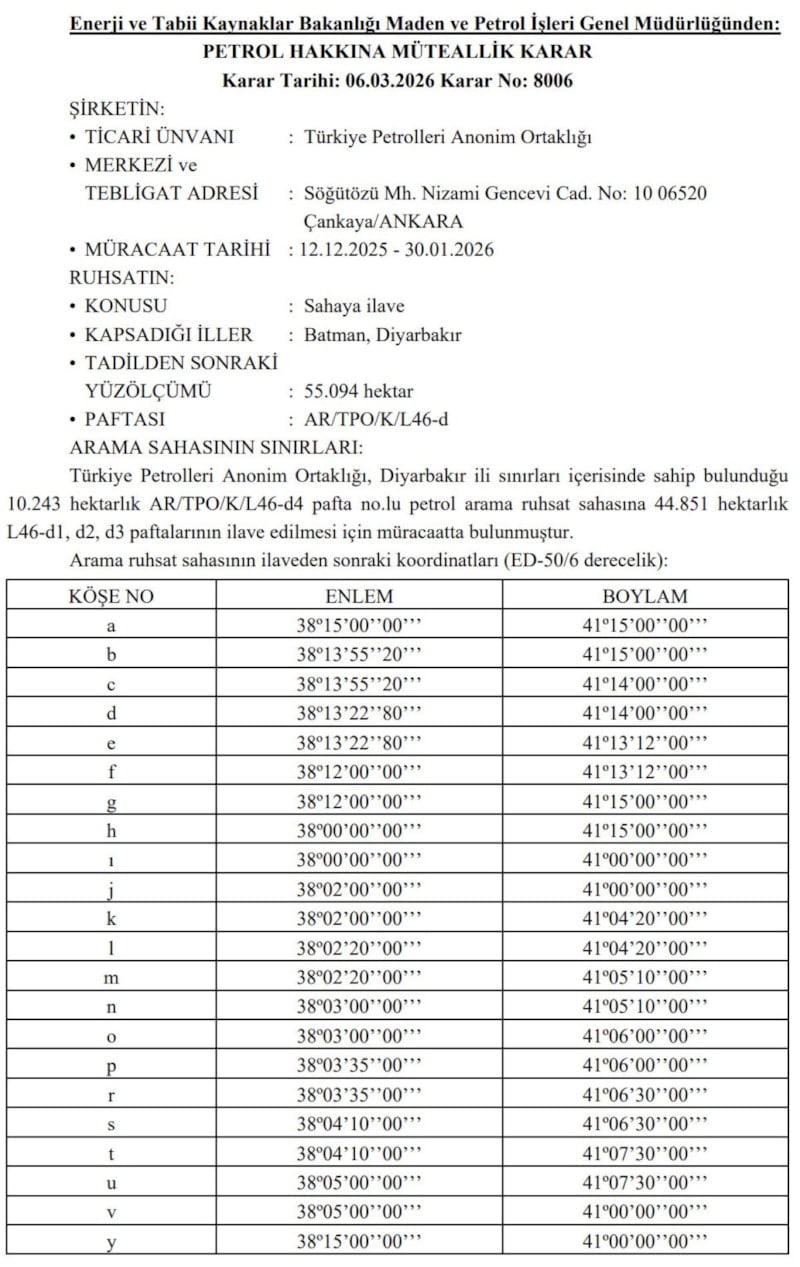 Buna göre, TPAO’nun Diyarbakır ilinde sahip olduğu 10 bin 243 hektarlık AR/TPO/K/L46-d4 pafta numaralı petrol arama ruhsat sahasına 44 bin 851 hektarlık L46-d1, d2 ve d3 paftaları ilave edildi.