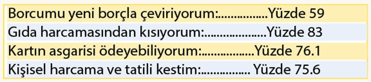 Yüzde 59’u mevcut borçlarını yeni borçlarla çeviren sağlıkçıların yüzde 83’ü son 6 ayda gıda harcamalarını kısmak zorunda kaldı. Sağlıkçıların yüzde 76.1’i kredi kartı borcunun yalnızca asgari tutarını ödeyerek borçlarını döndürmeye çalışırken yüzde 75.6’sı tatil veya kişisel ihtiyaçlarını tamamen kestiğini bildirdi.