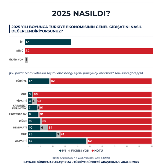 GÜNDEMAR geride bıraktığımız 2025 yılının vatandaşlara yansımasını araştırdı. Toplumun yaklaşık dörtte üçü 2025 yılının genel olarak kötü geçtiğini belirtirken, ekonomik gidişatın kötü olduğunu belirtenlerin oranı yüzde 82 oldu.