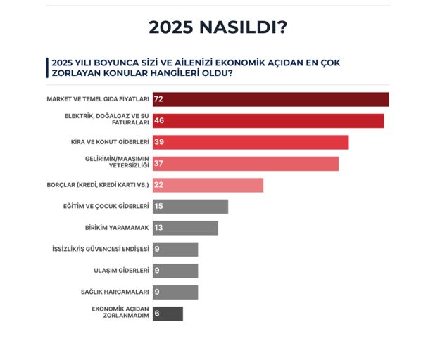 “2025 yılı boyunca sizi ve ailenizi ekonomik açıdan en çok zorlayan konular hangileri oldu?” sorusuna ankete katılanların yüzde 72’si market ve temel gıda fiyatlarının olduğunu söyledi.