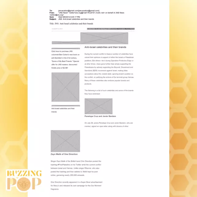 Bültende, aralarında Zayn Malik, Danny Glower, Penelope Cruz ve Javier Bardem’in de bulunduğu çok sayıda ismin, Filistin’e destek verdikleri gerekçesiyle “İsrail karşıtı” olarak sınıflandırıldığı görüldü. Belgede, bu ünlülerin iş birliği yaptığı markalara da özellikle yer verildi.