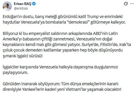 “Erdoğan’ın dostu, barış meleği görünümlü katil Trump ve emrindeki haydutlar Venezuela’ya bombalarla ‘demokrasi’ götürmeye kalkıyor. Biliyoruz ki bu emperyalist saldırının arkaplanında ABD’nin Latin Amerika’yı babasının çiftliği zannetmesi, Venezuela’nın doğal kaynaklarını kendi malı gibi görmesi yatıyor. Suriye’de, Filistin’de, Irak’ta çoluk çocuk demeden katliamlar yaparken hep böyle düşünüyordu şımarık işgalci sürüsü! İşgalciler karşısında Venezuela halkıyla dayanışma duygularımızı paylaşıyorum. Gönülden inanarak söylüyorum: Tüm dünya emekçilerinin kararlı direnişiyle Yankee’lerin kaderi yeni Vietnam’lar yaşamak olacaktır.”
