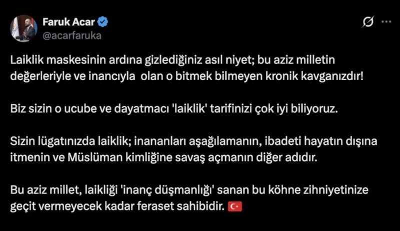 Laiklik maskesinin ardına gizlediğiniz asıl niyet; bu aziz milletin değerleriyle ve inancıyla olan o bitmek bilmeyen kronik kavganızdır!