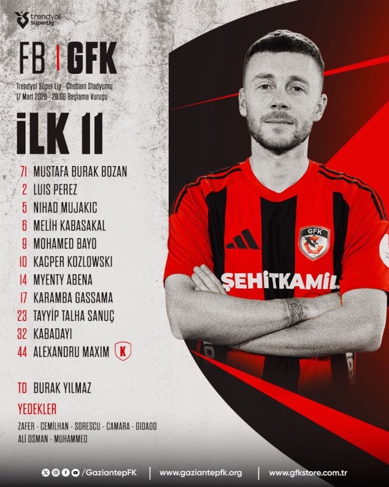 Fenerbahçe – Gaziantep FK maçının ilk 11’leri