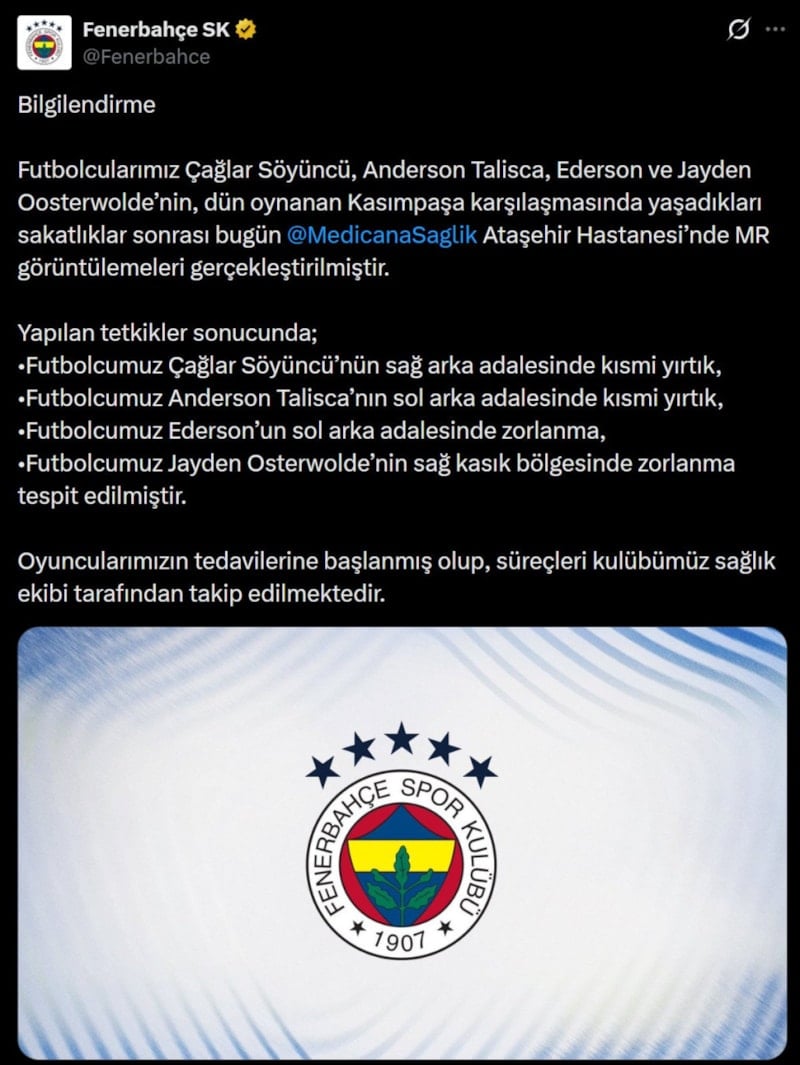 Fenerbahçe Kulübü, bu sakatlıkların ardından oyuncularının son durumlarını duyurdu.