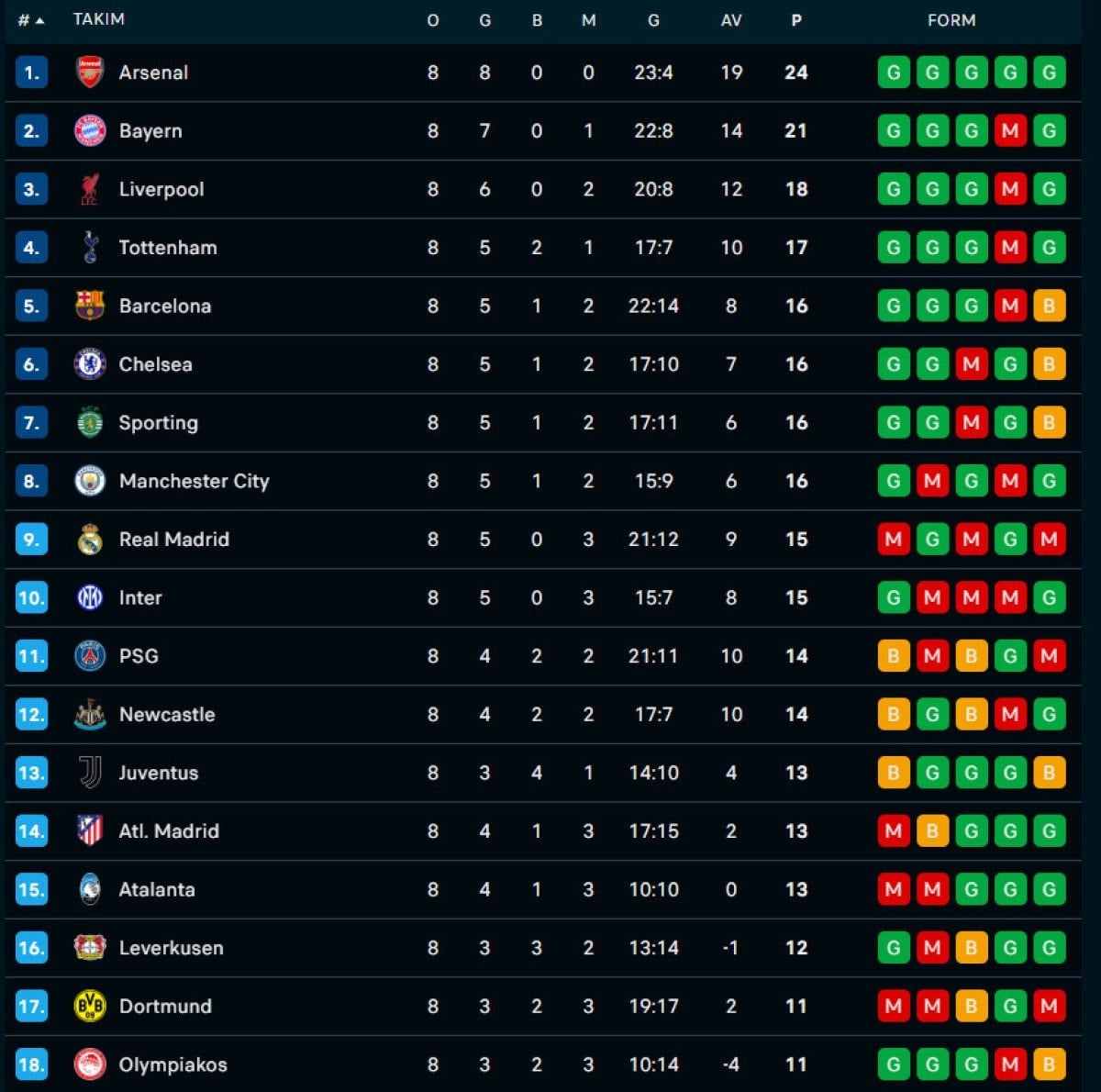 UEFA ŞAMPİYONLAR LİGİ’NDE PUAN DURUMU