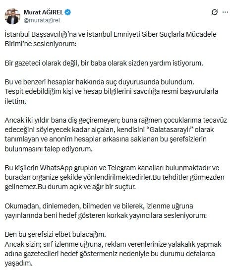 Gazeteci Murat Ağırel, çocuklarına yönelik tehditler nedeniyle bazı sosyal medya kullanıcıları hakkında suç duyurusunda bulundu.