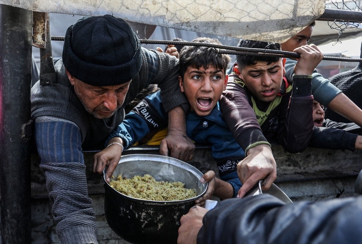 Sıcak yemek dağıtımı için saatlerce sıra bekleyen Filistinliler, çoğu zaman çocuklarının karnını doyurmaya yetecek tek bir öğünle yetinmek zorunda kalıyor.