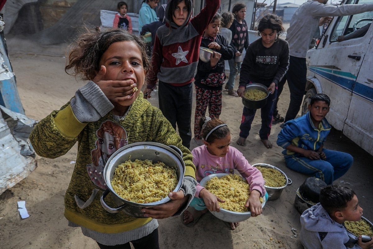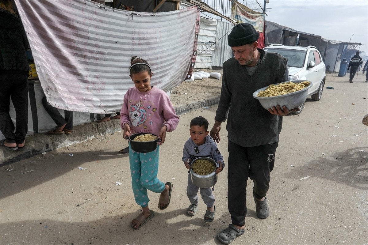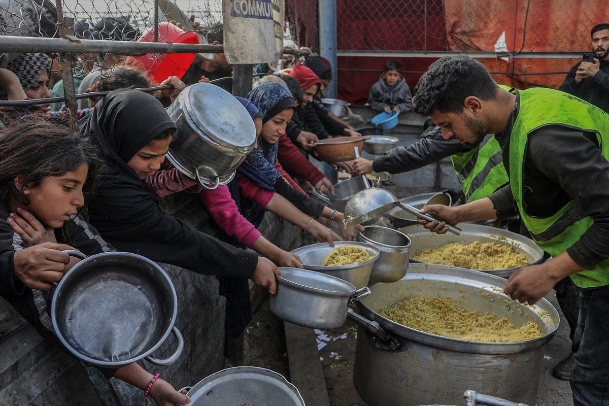 Gazze Şeridi’nin güneyindeki Han Yunus kentinin Mevasi bölgesinde yaşayan yüzlerce yerinden edilmiş Filistinli, bir öğün sıcak yemek alabilmek için kurulan hayır mutfaklarının önünde uzun kuyruklar oluşturuyor.