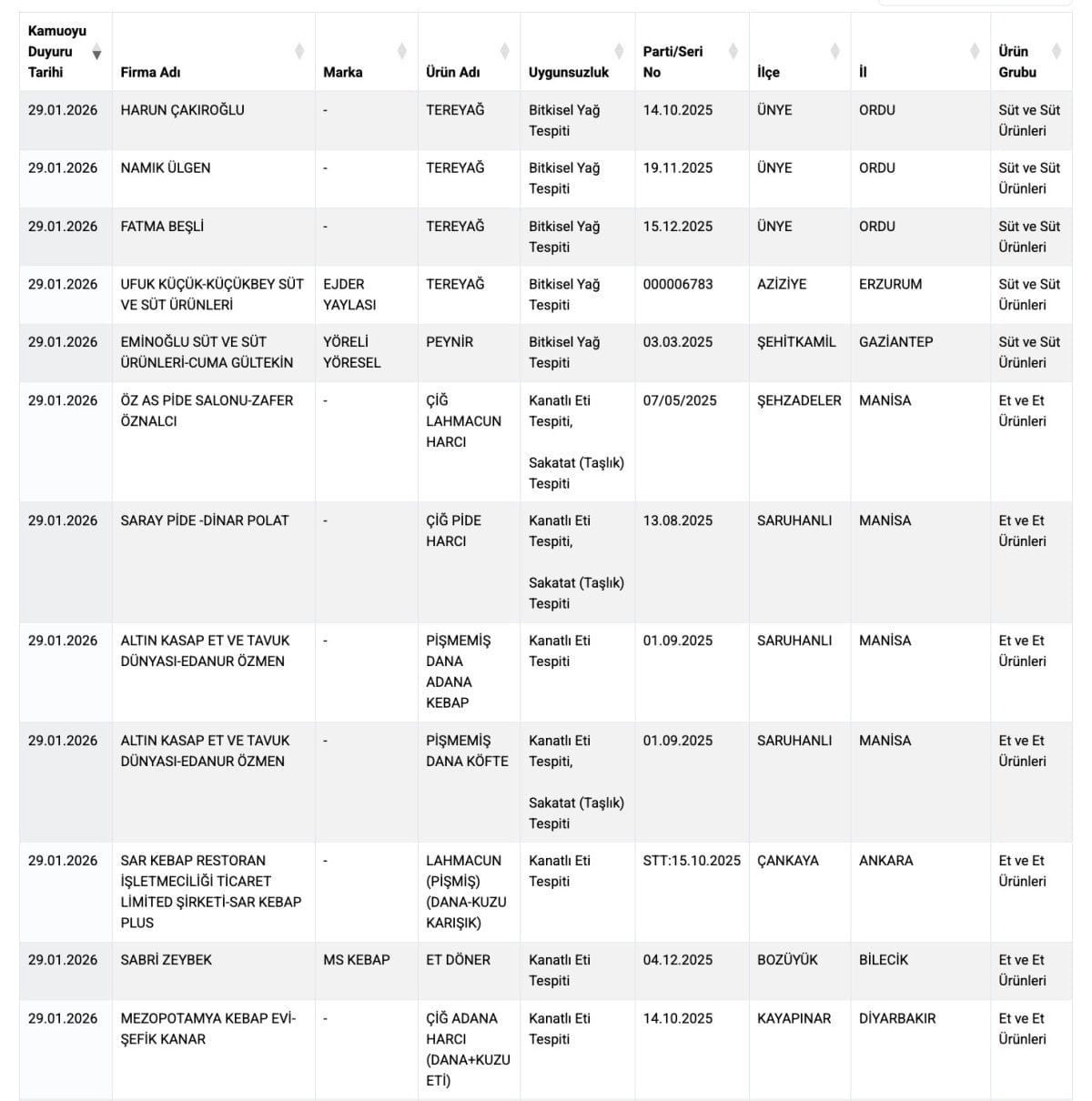 Tarım ve Orman Bakanlığı’nın 29 Ocak 2026 tarihli denetim sonuçları, gıda ürünlerinde ciddi uygunsuzlukları ortaya koydu. Denetimlerde; et ve et ürünlerinde kanatlı eti ile sakatat kullanımı tespit edilirken, baharatlarda ise domates karıştırılması ve gıdada kullanımına izin verilmeyen boya maddelerine rastlandı.