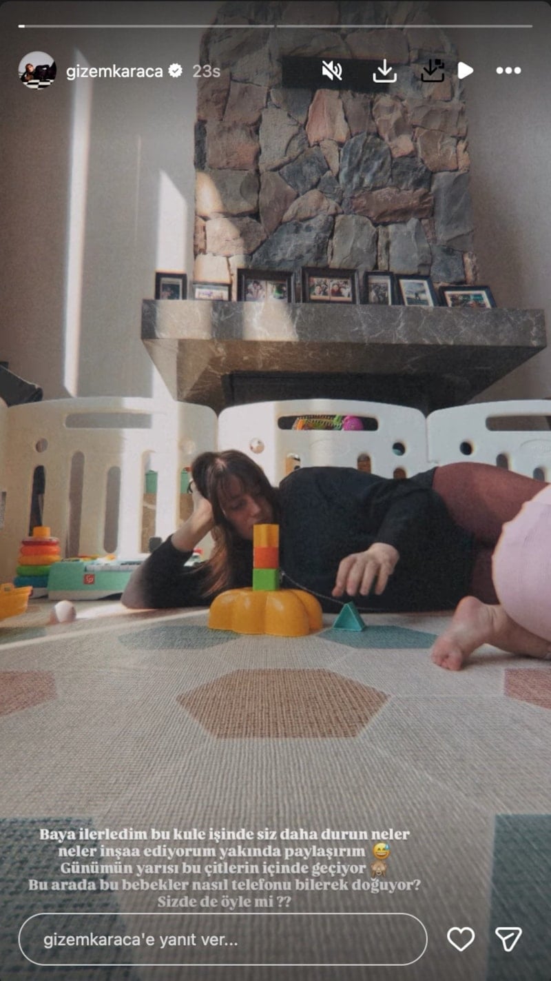 Ünlü oyuncu paylaşımına, “Baya ilerledim bu kule işinde, siz daha durun neler neler inşa ediyorum yakında paylaşırım. Günümün yarısı bu çitlerin içinde geçiyor. Bu arada bu bebekler nasıl telefonu bilerek doğuyor? Sizde de öyle mi?” notunu düştü.