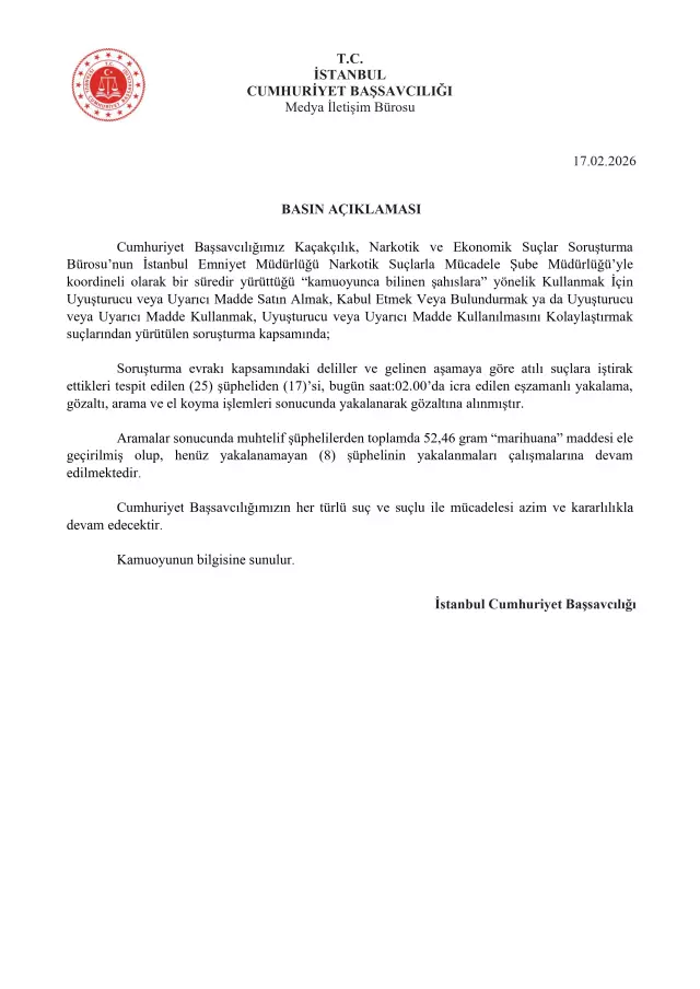 Operasyonla ilgili İstanbul Cumhuriyet Başsavcılığı’ndan yapılan açıklamada, “Cumhuriyet Başsavcılığımız Kaçakçılık, Narkotik ve Ekonomik Suçlar Soruşturma Bürosu’nun İstanbul Emniyet Müdürlüğü Narkotik Suçlarla Mücadele Şube Müdürlüğü’yle koordineli olarak bir süredir yürüttüğü “kamuoyunca bilinen şahıslara” yönelik Kullanmak İçin Uyuşturucu veya Uyarıcı Madde Satın Almak, Kabul Etmek veya Bulundurmak ya da Uyuşturucu veya Uyarıcı Madde Kullanmak, Uyuşturucu veya Uyarıcı Madde Kullanılmasını Kolaylaştırmak suçlarından yürütülen soruşturma kapsamında; Soruşturma evrakı kapsamındaki deliller ve gelinen aşamaya göre atılı suçlara iştirak ettikleri tespit edilen (25) şüpheliden (17)’si, bugün saat:02.00’da icra edilen eşzamanlı yakalama, gözaltı, arama ve el koyma işlemleri sonucunda yakalanarak gözaltına alınmıştır. Aramalar sonucunda muhtelif şüphelilerden toplamda 52,46 gram “marihuana” maddesi ele geçirilmiş olup, henüz yakalanamayan (8) şüphelinin yakalanmaları çalışmalarına devam edilmektedir. Cumhuriyet Başsavcılığımızın her türlü suç ve suçlu ile mücadelesi azim ve kararlılıkla devam edecektir.” denildi.