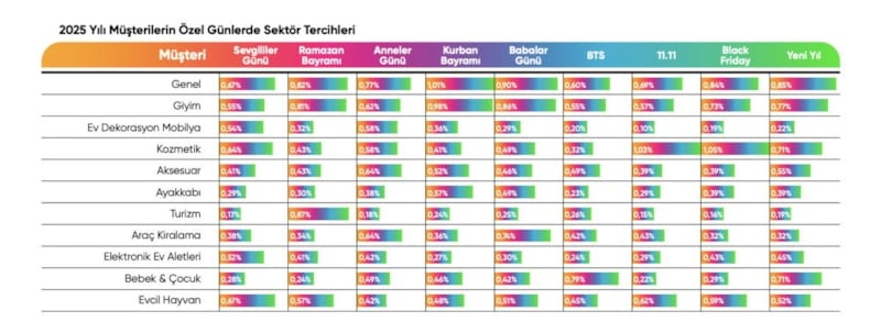 Perakende takviminde yer alan özel günlerin etkisi de değişmeye başladı. 2025 yılında birçok özel gün, bir önceki yıla kıyasla daha düşük performans gösterdi. Kurban Bayramı ve Babalar Günü hala lider dönemler olarak zirvede yer alsa da bazı kampanya dönemlerinde belirgin düşüşler dikkat çekti. Özellikle 11.11 kampanyalarında 5 puanlık gerileme görülürken, Black Friday ve yılbaşı dönemlerinde de bir önceki yıla göre 2-3 puanlık düşüş yaşandı.