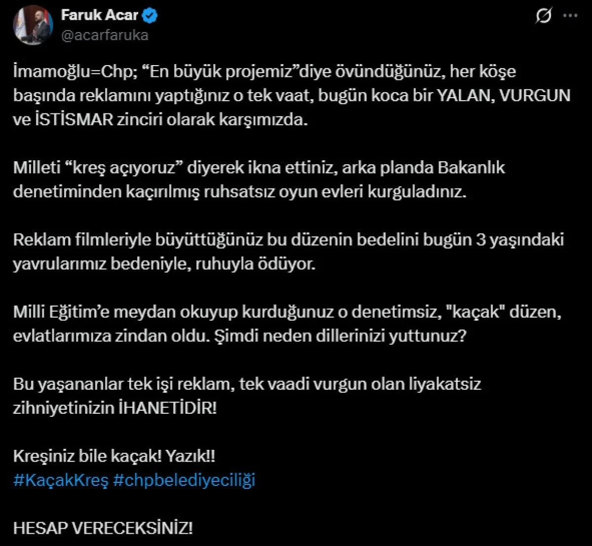“Bu yaşananlar tek işi reklam, tek vaadi vurgun olan liyakatsiz zihniyetinizin ihanetidir. Hesap vereceksiniz” ifadelerini kullanan Acar’ın paylaşımı şu şekilde: