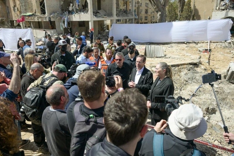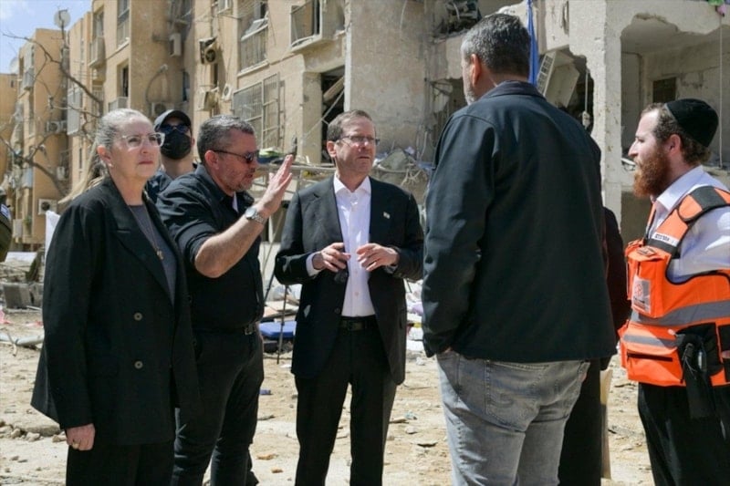 İsrail Cumhurbaşkanı Isaac Herzog ve İsrail Başbakanı Binyamin Netanyahu İran’ın İsrail’e yönelik misilleme saldırısında bir füzenin isabet ederek hasara yol açtığı Arad kentinde incelemelerde bulundu.