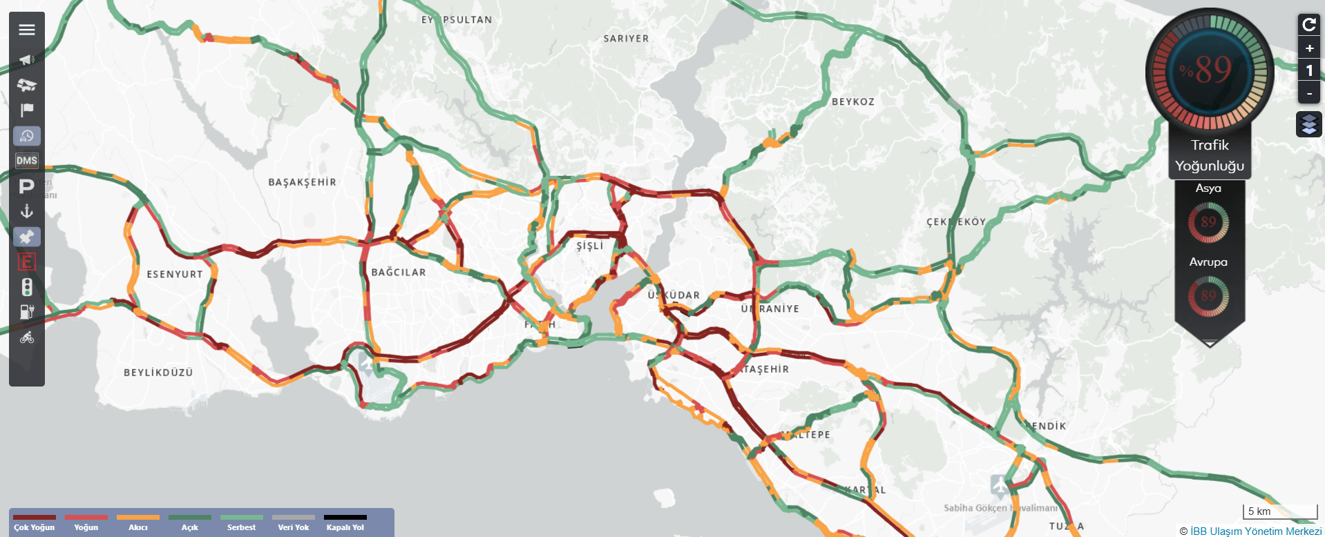 İstanbul Büyükşehir Belediyesinin CepTrafik uygulaması verilerine göre, kent genelindeki trafik yoğunluğu yüzde 89’a kadar çıktı. Yoğunluk, Avrupa Yakası’nda yüzde 89’a, Anadolu Yakası’nda ise yüzde 85’e kadar ulaştı.