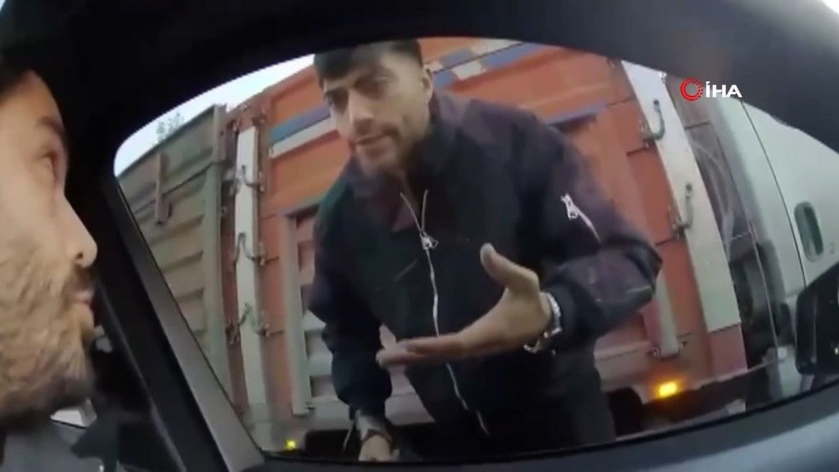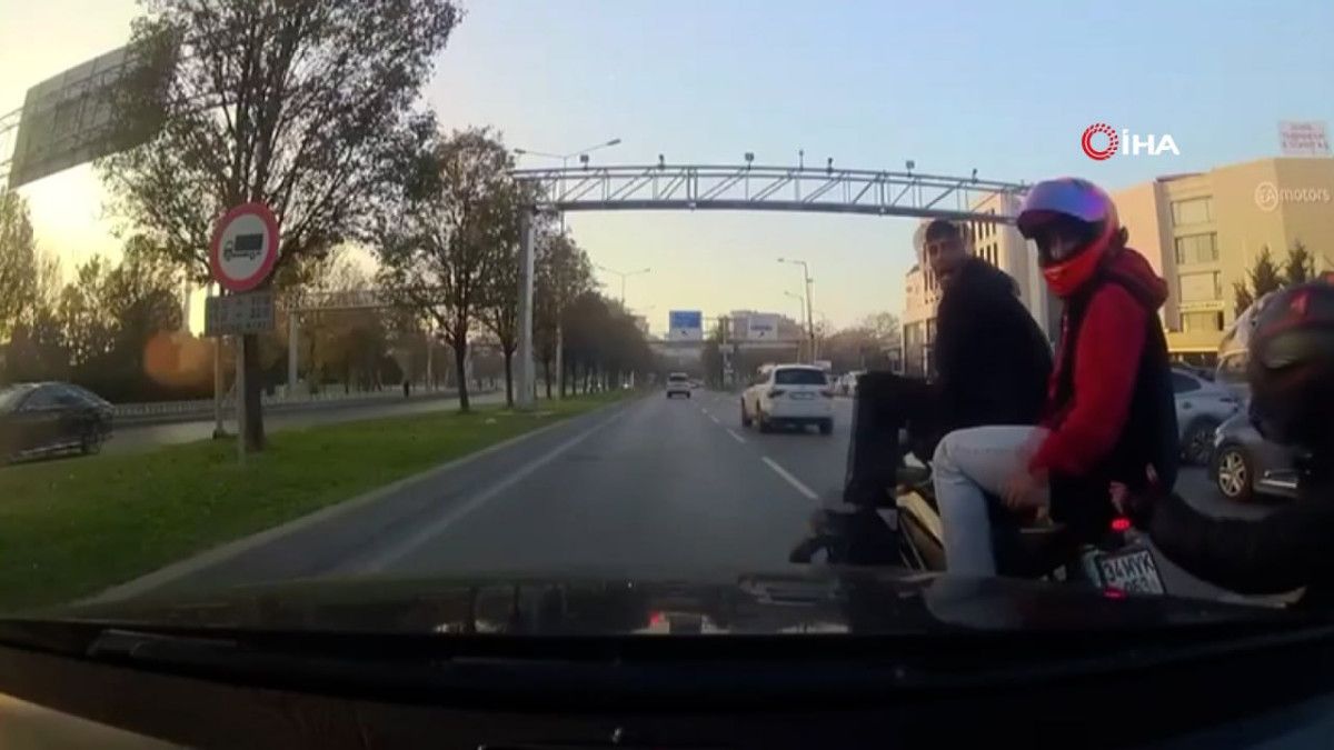Görüntülerde, motosikletlinin yoğun trafikte iki otomobilin arasından geçtiği sırada şeridinde giden aracın önüne kırdığı, şoförün ise korna çalması üzerine motosikletten inerek vatandaşa hakaretler yağdırarak otomobili tekmelediği anlar yer aldı.