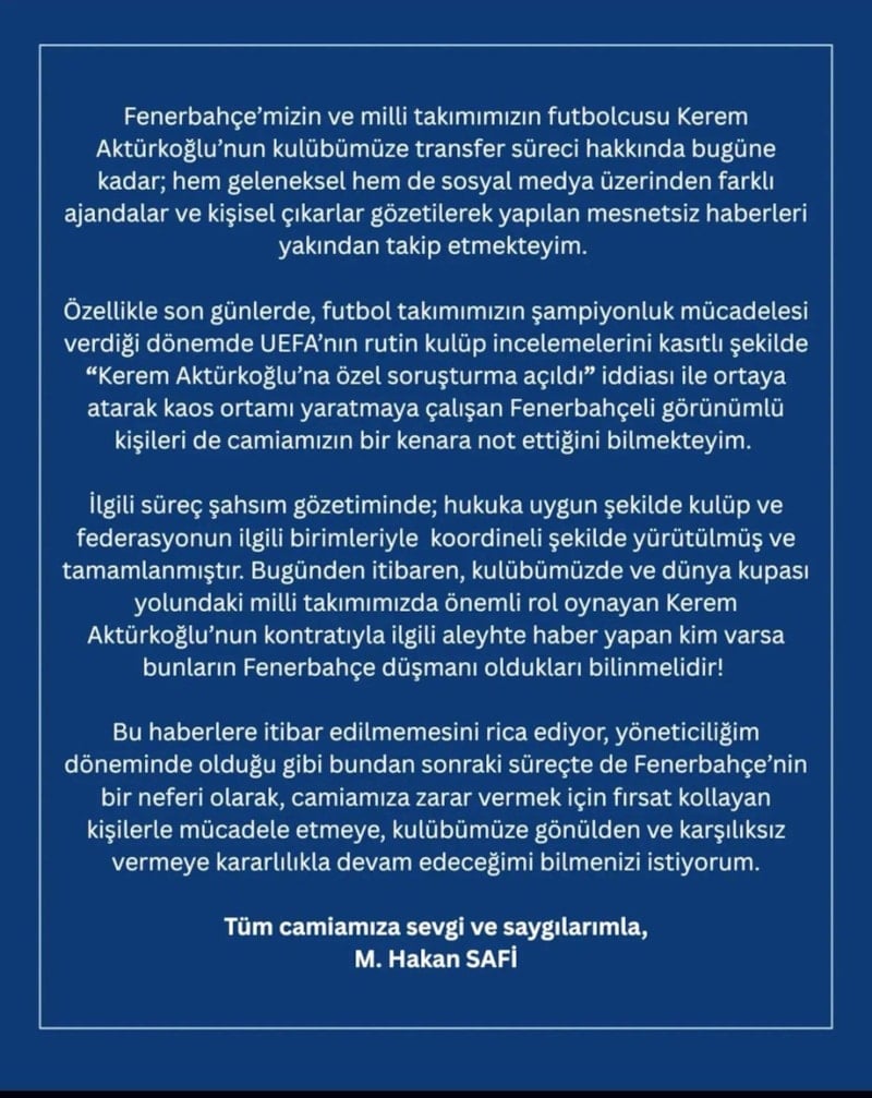 İlgili süreç şahsım gözetiminde; hukuka uygun şekilde kulüp ve federasyonun ilgili birimleriyle koordineli şekilde yürütülmüş ve tamamlanmıştır. Bugünden itibaren, kulübümüzde ve dünya kupası yolundaki milli takımımızda önemli rol oynayan Kerem Aktürkoğlu’nun kontratıyla ilgili aleyhte haber yapan kim varsa bunların Fenerbahçe düşmanı oldukları bilinmelidir!