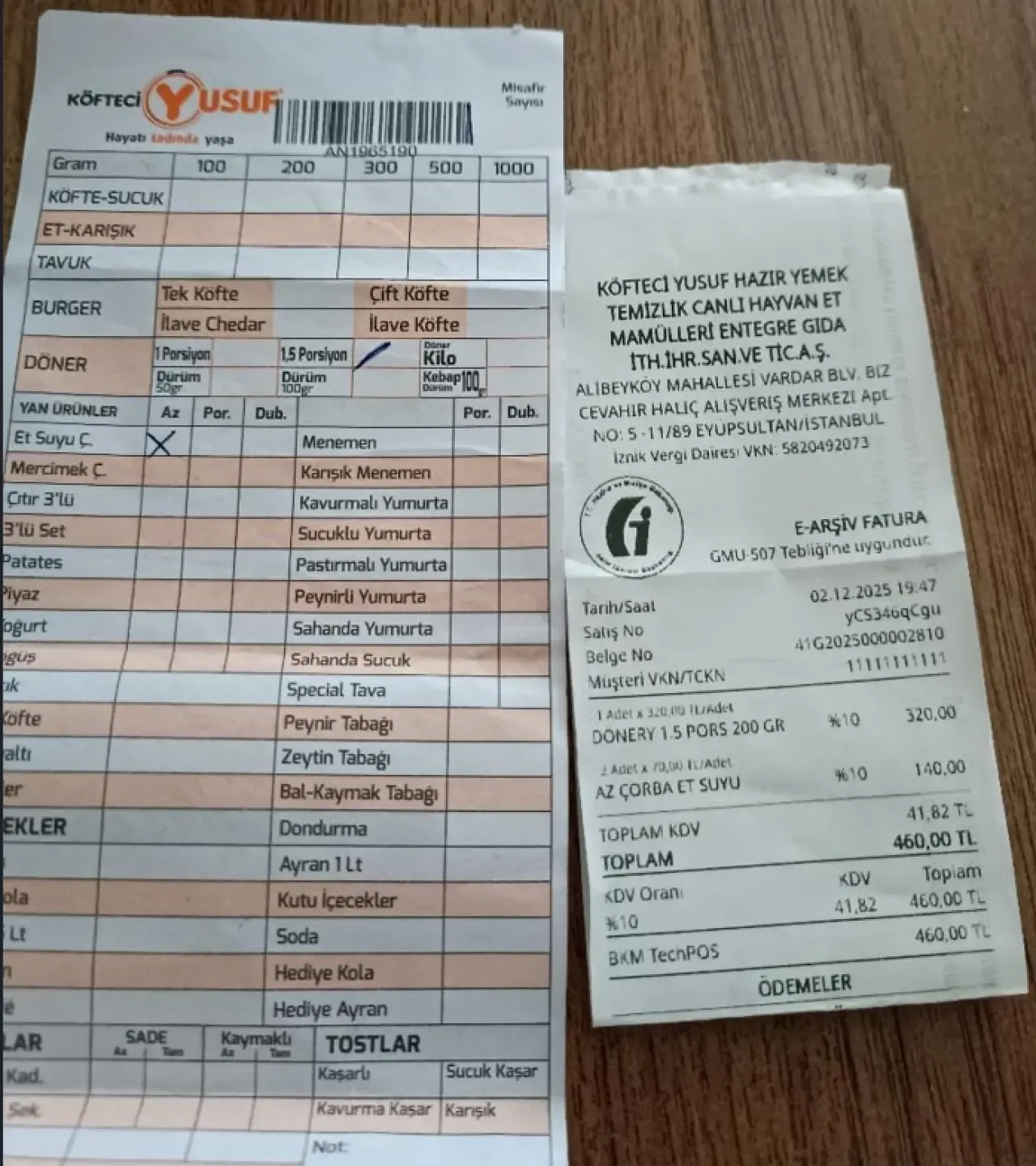 Çok ailesi, Eyüpsultan Tüketici Hakem Heyeti’ne yapılan başvuruda, uyuşmazlık bedeli 460 TL olarak belirtildi. Fiş, adisyon ve içinde çivi bulunan döner fotoğrafı delil olarak başvuruya eklendi.