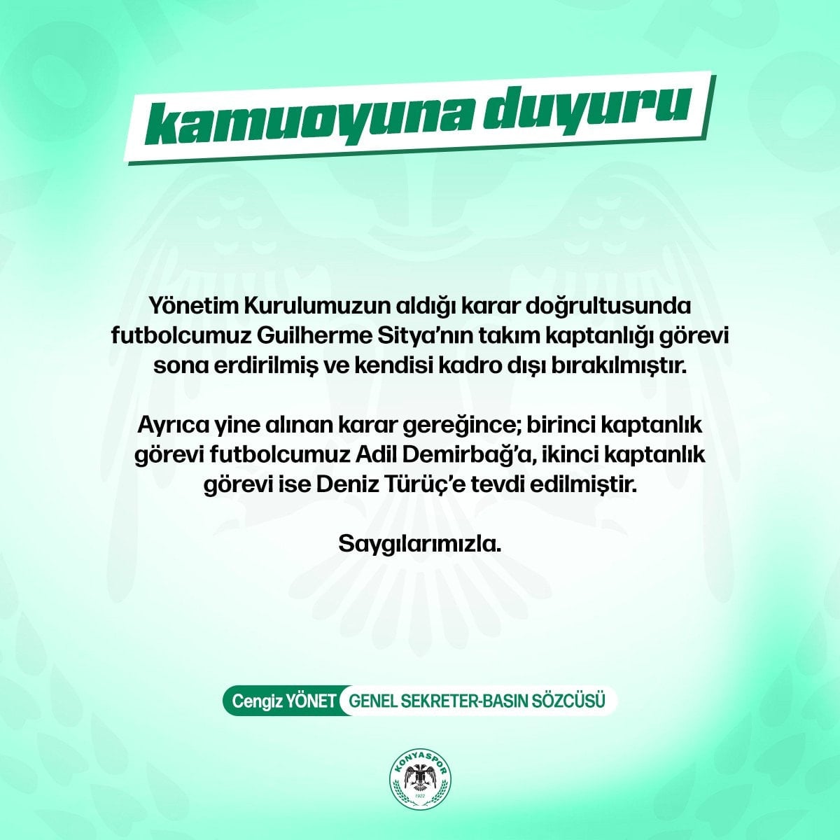Yönetim kurulumuzun aldığı karar doğrultusunda futbolcumuz Guilherme Sitya’nın takım kaptanlığı görevi sona erdirilmiş ve kendisi kadro dışı bırakılmıştır. Ayrıca yine alınan karar gereğince birinci kaptanlık görevi futbolcumuz Adil Demirbağ’a, ikinci kaptanlık görevi ise Deniz Türüç’e tevdi edilmiştir.