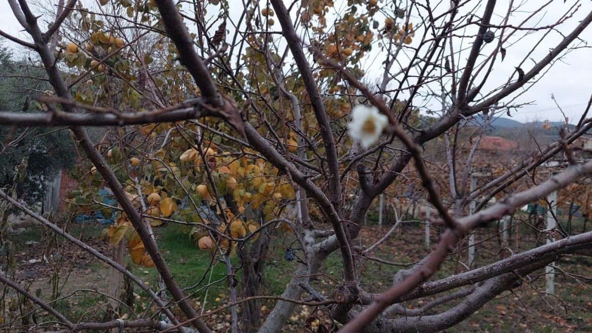 Mevsim şartlarına aykırı olarak çiçek açan erik ağacı, mahalle sakinlerinin de dikkatini çekti.