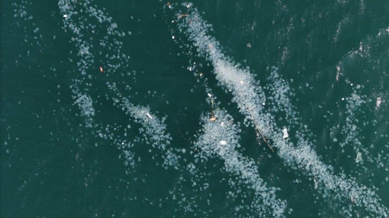 Görüntülerde, akıntı hattı boyunca kümelenen deniz analarının yer yer beyaz şeritler oluşturduğu görüldü.