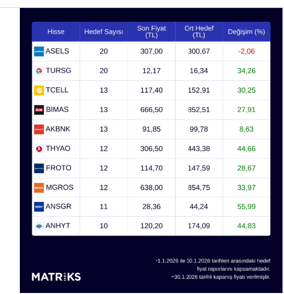 Matriks Haber’in 1 Ocak – 30 Ocak 2026 tarihleri arasında paylaştığı hedef fiyat raporlarından derlediği bilgiye göre, bu dönemde en çok sayıda tavsiye raporu paylaşılan hisse senedi 20’şer kurumun raporu ile Aselsan ve Türkiye Sigorta oldu.