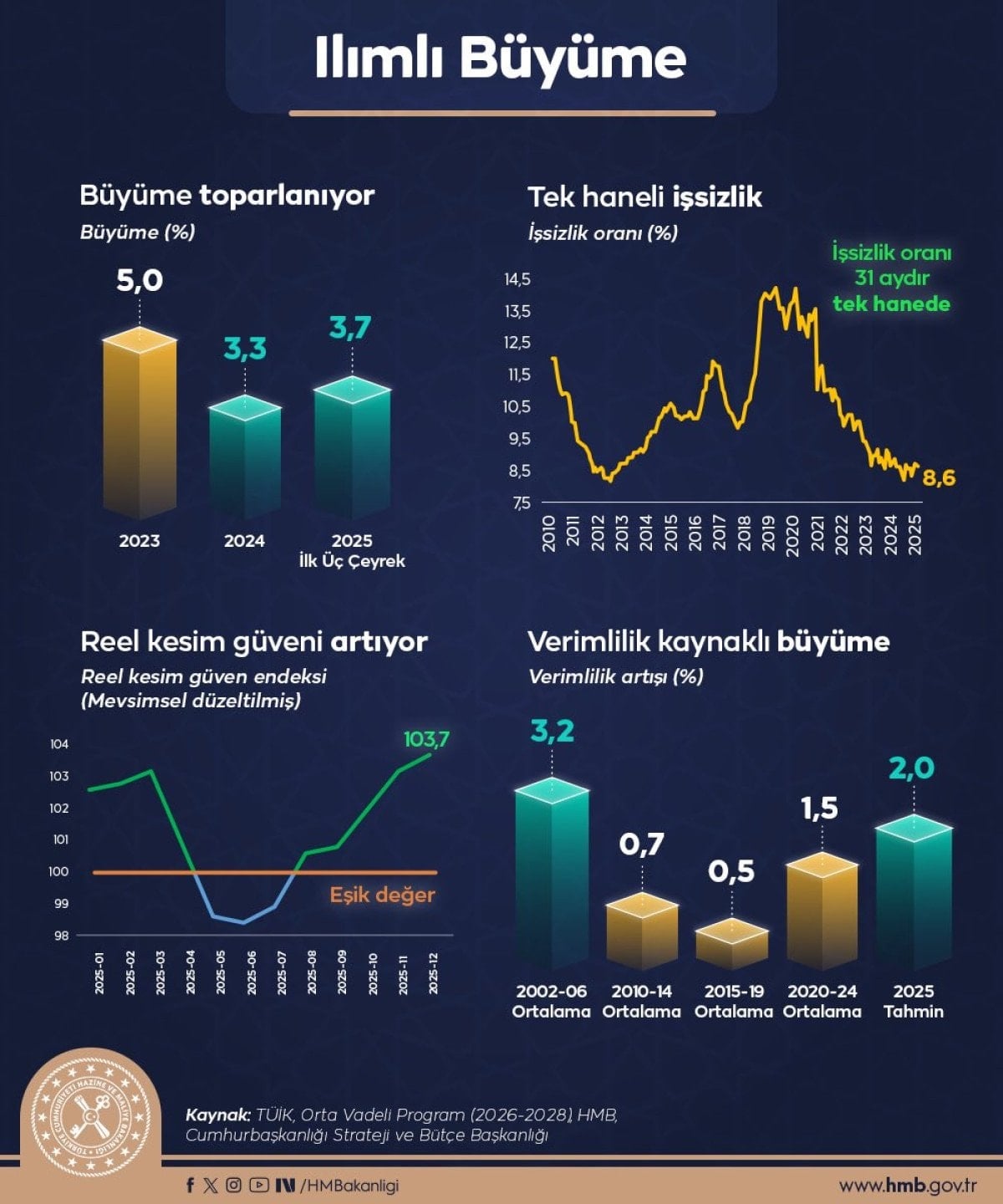 Hazine ve Maliye Bakanı Mehmet Şimşek, 2025’in muhasebesi için güçlenen mali disiplin, enflasyon düşüyor, sürdürülebilir cari açık, azalan dış finansman ihtiyacı, ılımlı büyüme konularında grafikler paylaştı.