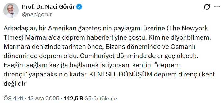 Sosyal medya hesabından açıklama yapan yer bilimci Prof. Dr. Naci Görür; Marmara Denizi’nde tarihten önceki dönem, Bizans dönemi ve Osmanlı döneminde meydana gelen depremleri anımsatarak “Cumhuriyet döneminde de er geç olacak” dedi.
