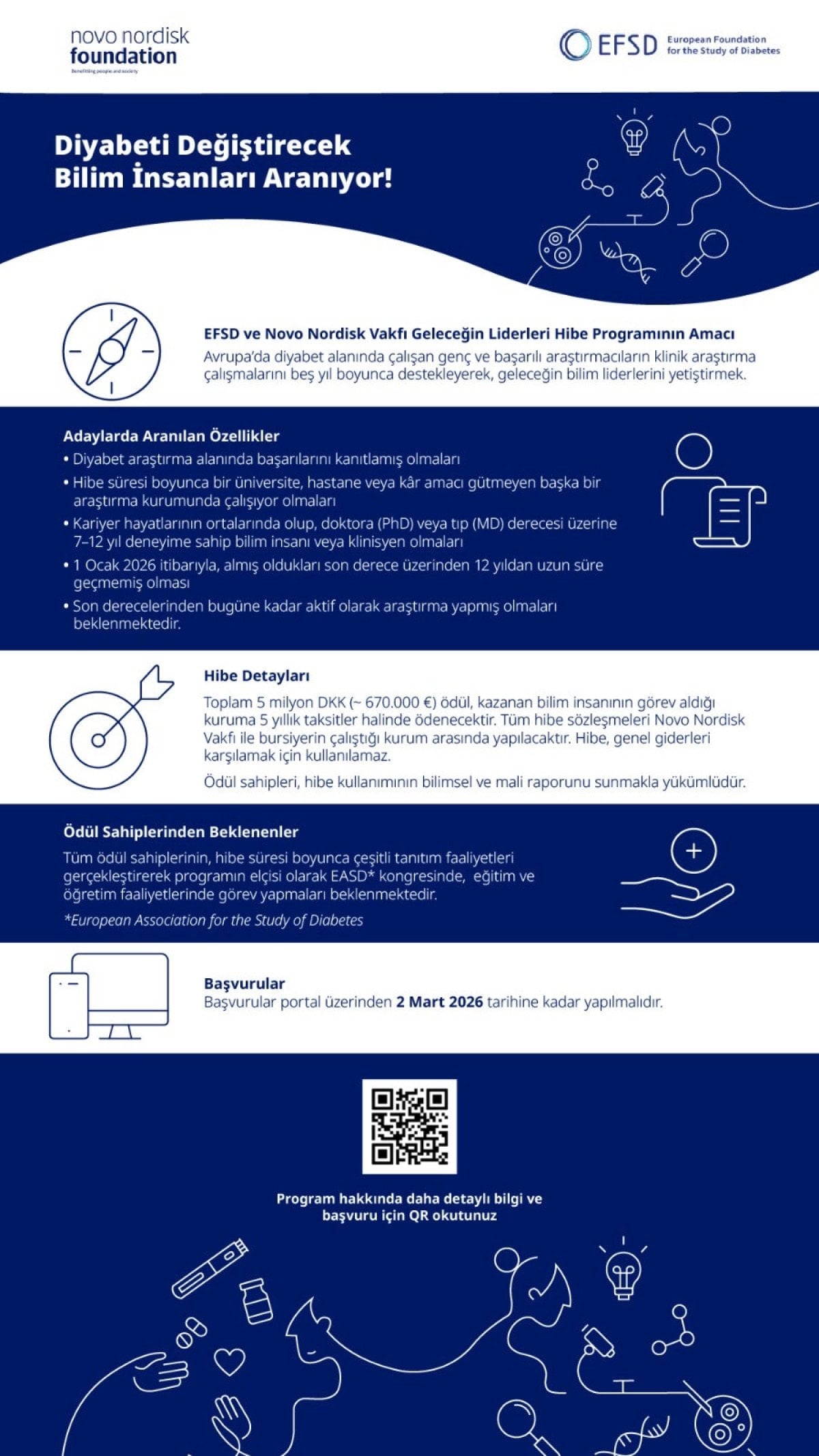 Başvurular, EFSD’nin çevrim içi başvuru sistemi üzerinden 2 Mart 2026 tarihine kadar yapılabilecek. Programın kapsamı, uygunluk kriterleri ve başvuru sürecine ilişkin detaylı bilgiler EFSD ve Novo Nordisk Vakfı’nın resmi kanalları üzerinden paylaşılıyor.