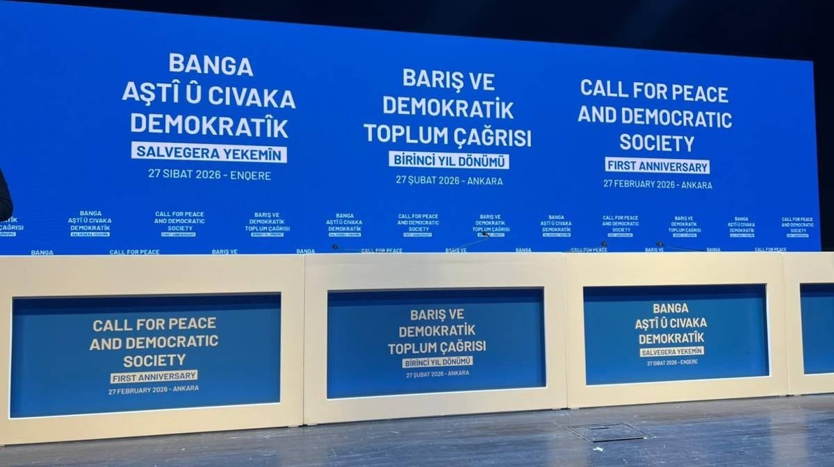 Arka planda Türkçe, Kürtçe ve İngilizce olarak “Barış ve Demokratik Toplum Çağrısı – Birinci Yıl Dönümü – 27 Şubat 2026 Ankara” ifadesi yer alıyor. İngilizce olarak da “Call for Peace and Democratic Society” yazılmış. Bu çok dilli mesaj, hem iç hem de dış kamuoyuna hitap eden bir deklarasyon niteliği taşıyor.