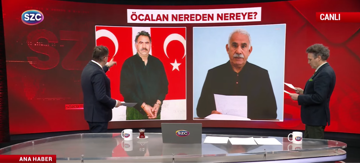 Okunan mesajla birlikte heyetin toplandığı salonun karesi ve Öcalan’ın mesajının siyasal iletişimdeki alt metinleri Sözcü TV Ana Haber’de masaya yatırıldı.