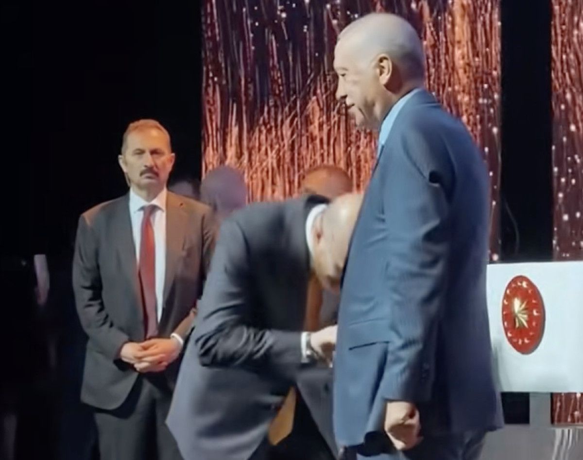 Protokol gereği önce tokalaşan baba-oğul, ardından Bilal Erdoğan’ın el öpme jestiyle duygusal bir an yaşadı.